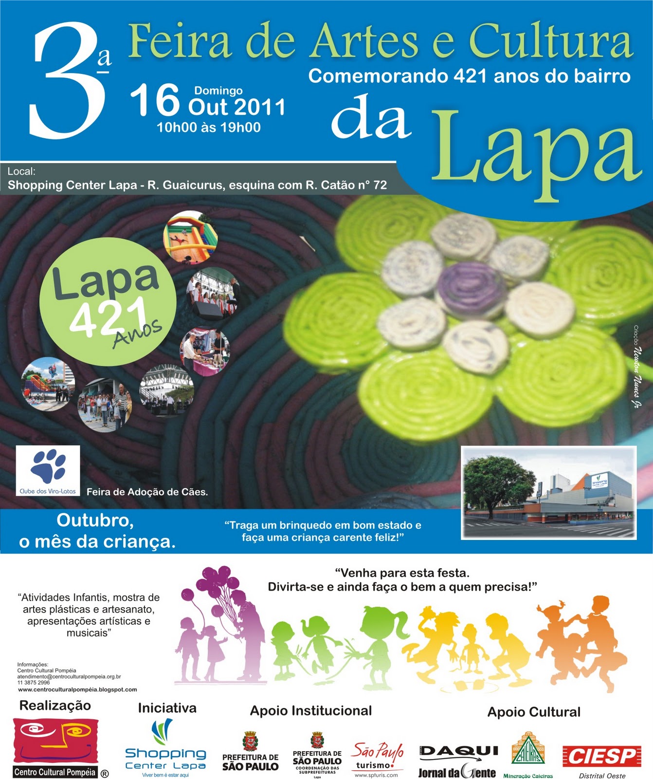 O bairro popularmente conhecido como “Lapa” receberá a terceira edição da “Feira de Artes e Cultura da Lapa” nodomingo (16), das 10h às 19h, no estacionamento externo e no interior do prédio do Shopping Center Lapa.